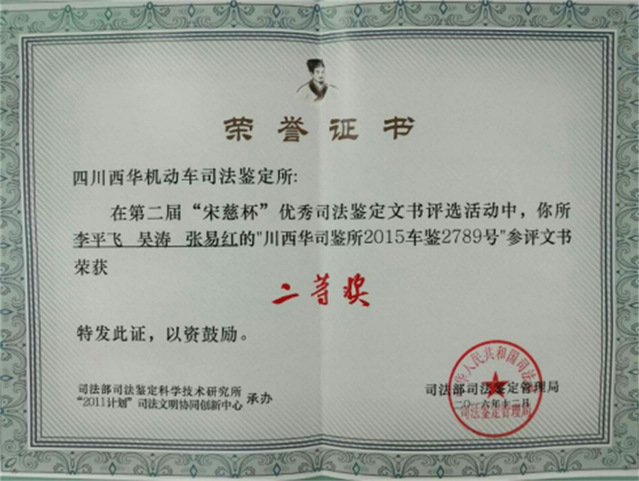 第二届“宋慈杯”优秀司法鉴定文书二等奖证书