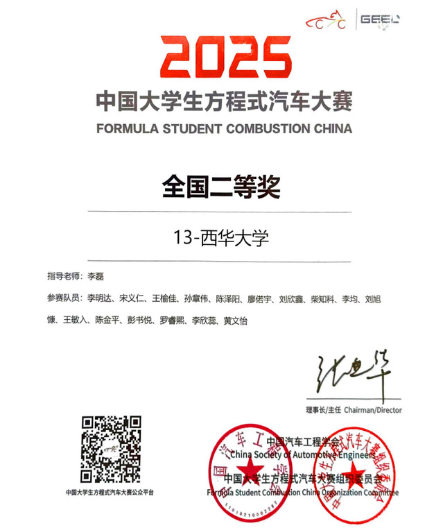 10月12日,2025“吉利杯”中国大学生方程式汽车大赛在郑州圆满落幕。西华大学大学生燃油方程式车队凭借扎实的技术功底与出色的现场发挥,最终斩获全国二等奖,并在多个赛项中表现优异,展现出卓越的工程实践与临场应变能力。