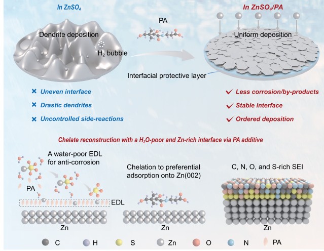水系锌金属电池因其安全性高、成本低和环境友好等优势,被认为是新一代大规模储能的潜在备选技术。然而,锌金属负极在充放电过程中易发生枝晶生长及水诱导腐蚀副反应,严重影响了电池的循环寿命、倍率性能及实际应用前景。为此,本论文提出了一种基于泛酸(PA)的螯合重构策略。PA 分子可通过羧基和酰胺基与 Zn2+形成稳定螯合结构,重构内亥姆霍兹层(IHP),构建出一种“富锌、贫水”的电双层界面结构(EDL),该界面结构能够有效削弱水分子参与的腐蚀反应,从而显著提升锌负极界面稳定性。