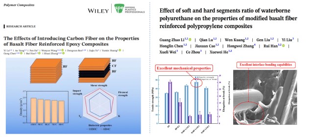 针对纤维增强复合材料,团队李光照副研究员和张帅博士提出了通过水性聚氨酯改善玄武岩纤维表面化学活性,创新性地采用预聚合工艺制备高性能热固性树脂,深入探讨预聚合对固化反应活性、化学结构以及最终复合材料性能的影响,并将其与碳纤维布混杂铺层,将复合材料的抗拉强度提高了32.5%,并显著改善了复合材料的耐热震、耐腐蚀、耐火烧、抗高温变形等性能。相关工作发表于《Polymer Composites》《Journal of Applied Polymer Science》等期刊。