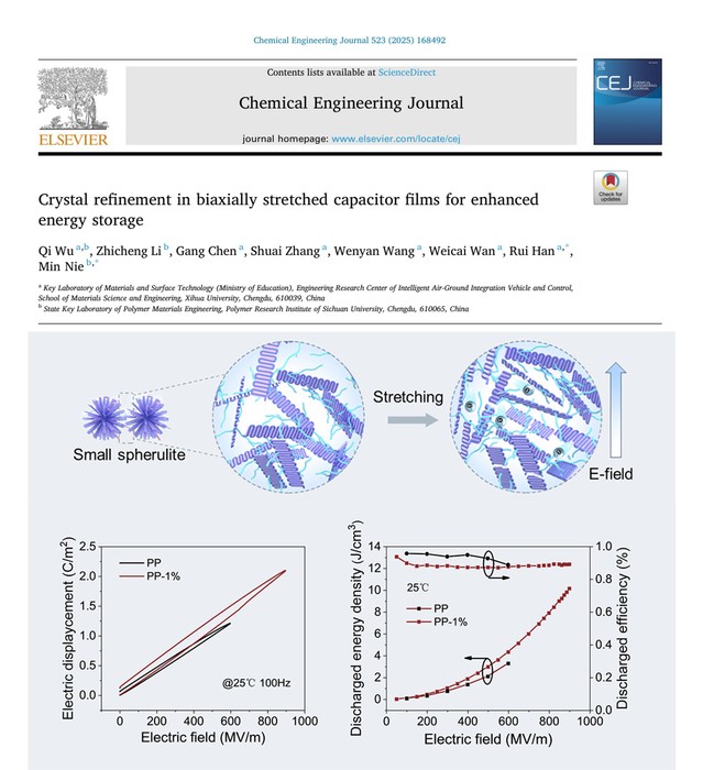 在聚合物薄膜电容器领域,团队创新性地提出“晶粒尺寸精细化调控”策略。通过在聚丙烯体系中引入微量组分,实现对初始晶体结构的精准控制。基于此制备的聚丙烯薄膜展现出卓越的综合性能:击穿场强高达958 MV/m,放电能量密度达到10.2 J/cm³,同时兼具优异的力学韧性和长期使用可靠性。该研究突破了传统单纯追求高结晶度的技术路线,开创了通过晶体尺寸精准调控优化薄膜介电性能的新范式。该工作以韩锐教授为通讯作者发表于一区TOP杂志《Chemical Engineering Journal》(见图1)。