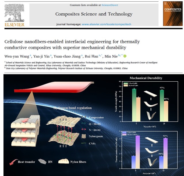 面向热管理材料,团队提出一种通过纤维素纳米纤维诱导的界面工程设计策略,成功制备出兼具高导热与优异机械耐久性的尼龙基复合材料。该材料面内导热系数达4.5 W·m⁻¹·K⁻¹,较纯尼龙提升超过1857%,并且兼具优异的力学稳定性与耐疲劳特性。该工作为柔性电子等领域高鲁棒性热管理材料提供了创新解决方案,并以王文燕博士为第一作者、韩锐教授为通讯作者发表于二区TOP期刊《Composites Science and Technology》(见图2)。