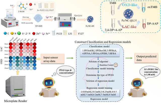 近日,理学院张国麒团队在国际权威期刊《Chemical Engineering Journal》(中科院一区Top,IF=13.2)发表题为“Machine learning-assisted sensor array based on enhanced dual enzyme-like activities of Fe SAzymes modulated via Pluronic surfactant for multi-category perfluoroalkyl intelligent recognition and quantification”的研究性论文,理学院2023级化学专业研究生蒋文彩为第一作者,数学系侯智博博士、化学系赵艳教授和张国麒博士为该论文的通讯作者,西华大学为第一通讯单位。