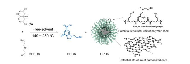 荧光小分子(HECA)和碳化聚合物点(CPDs)的构筑及其核-壳结构示意图