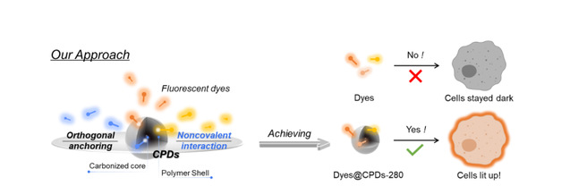 正交锚定策略:利用CPDs独特的核-壳结构来创建基于非共价相互作用的分子负载纳米载体,这导致相对于游离染料增强的细胞荧光成像,并证实了载体依赖性摄取。