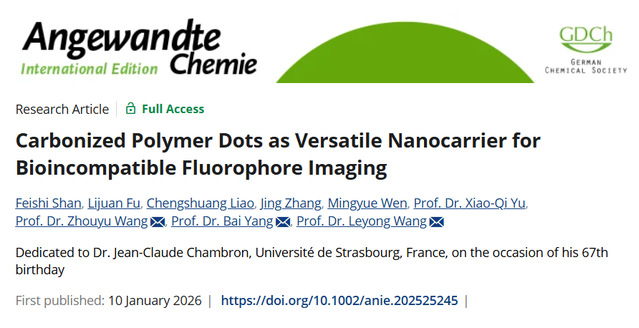 近日,西华大学碳点研究团队在化学领域TOP期刊发表研究成果。西华大学王周玉教授与吉林大学杨柏教授、南京大学王乐勇教授合作,在国际学术期刊《Angew. Chem. Int. Ed.(IF=17)发表题为“Carbonized Polymer Dots as Versatile Nanocarrier for Bioincompatible Fluorophore Imaging”的研究论文,报道了一种基于正交锚定策略的碳化聚合物点(Carbonized Polymer Dots,CPDs)纳米载体,成功实现了膜不可透过荧光分子的高效细胞递送与成像。