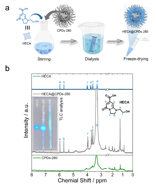 (a)HECA@CPDs-280和细胞成像的组装过程示意图。(b)HECA(蓝色)、HECA@CPDs280(灰色)和CPDs-280(绿色)的核磁共振氢谱。插图:在365 nm下的TLC分析。