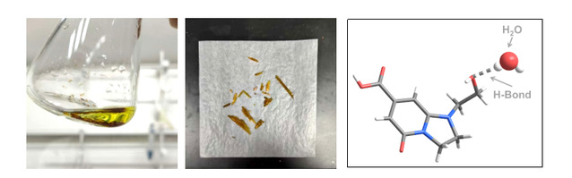 研究初期,团队发现所制备的系列CPDs的荧光量子产率(PLQY)随合成温度升高(140 °C → 280 °C)而显著下降(21.9% → 1.7%),推测在较低温(~140 °C)条件下,体系中可能存在荧光小分子与CPDs的生成平衡。为此,团队在低温合成CPDs后,对透析袋外液进行收集浓缩,并计划后续纯化,令人欣喜的是,在锥形瓶底部析出了一些黄色晶体,通过单晶衍射测试,解析出它的结构,并将其命名为HECA。