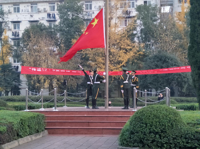 在庄严的国歌声中,五星红旗冉冉升起。牢记历史,勿忘国耻。校国旗护卫队队长魏杰带领全体同学进行了国旗下的宣誓。紧接着,国旗护卫队学生代表胡渝同学宣读了《纪念“一二•九”运动八十二周年倡议书》,呼吁大家发扬“一二•九”精神,不断朝着理想前进。