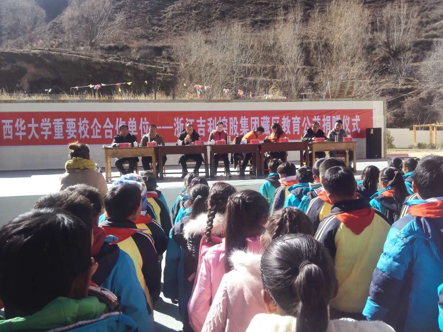 12月15日下午,我校友好合作企业——浙江吉利控股集团成都公司经理杨荣东、李乾专员代表集团赴我校对口帮扶的甘孜州巴塘县中咱小学举行教育公益捐赠仪式。巴塘县教育局副局长林晓蓉、巴塘县中咱镇党委副书记李健、中咱村支书甲措、中咱小学全校教师、学生及受捐学生家长参加捐赠仪式。捐赠仪式由我校挂任巴塘县委办公室副主任、教育体育局副局长李强主持。