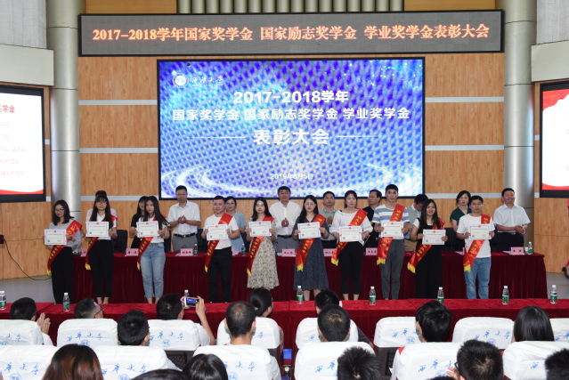 学生工作部部长王大清宣读了研究生国家奖学金、本专科学生国家奖学金表彰文件及获奖学生名单;宣传部部长山述兰宣读了本专科学生国家励志奖学金、研究生学业奖学金表彰文件及获奖学生名单。随后,主席台就坐领导为获奖学生代表颁奖。