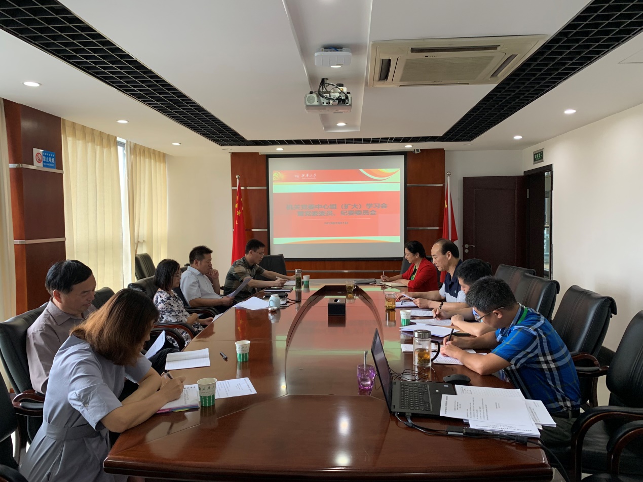 7月11日,机关党委在行政楼413会议室召开中心组(扩大)学习会。机关党委委员、纪委委员、工会委员参加会议,机关党委书记王代言主持学习会。会议强调,要深入学习领会上级组织文件精神,认真贯彻落实学校党委的工作部署,进一步增强政治自觉、思想自觉和行动自觉。