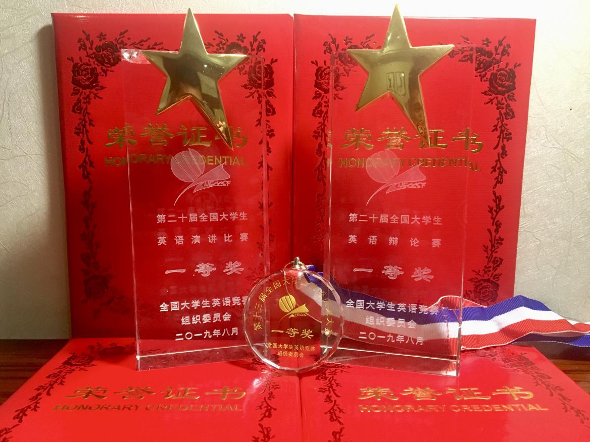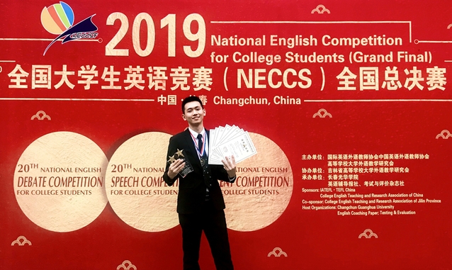 8月2日至8日,2019年全国大学生英语竞赛全国总决赛(National English Competition for College Students Grand Final) 在吉林长春举行。经过激烈角逐,我校外国语学院翻译专业2016级学生熊凌崧包揽所有比赛项目一等奖,获第二十届全国大学生英语演讲比赛一等奖、第二十届全国大学生英语辩论赛一等奖、第十三届全国大学生英语风采大赛一等奖,并担任辩论赛主持人工作,表现优异,被评为“优秀主持人”、“优秀参赛选手”。此前,熊凌崧同学获四川赛区B类(英语专业组)特等奖,成功晋级全国总决赛。