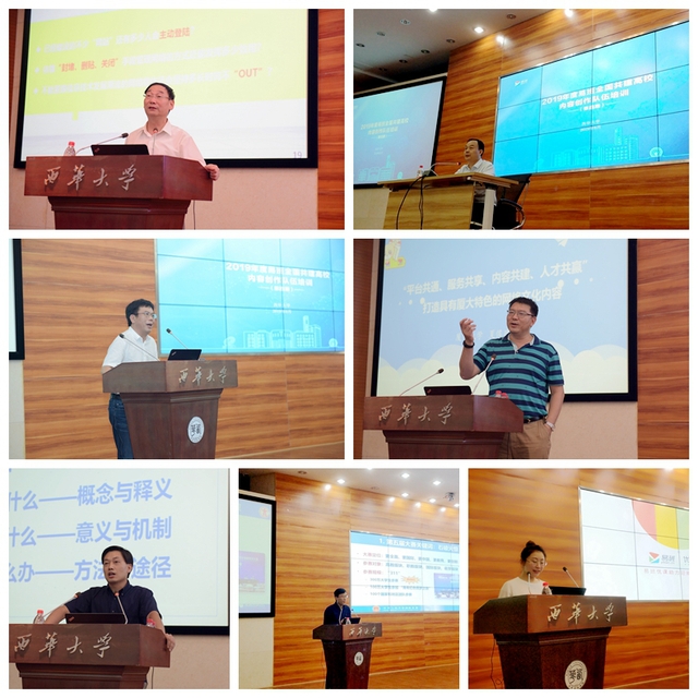 培训班上,教育部思想政治理论课教学指导委员会副主任委员、全国形势与政策分教指委主任委员高德毅以《网络思政创新和安全体系的建设》为题作了专题讲座,四川省教育厅宣传思想统战处副处长刘海峰以《意识形态领域的风险挑战和对策》为题作了专题讲座,西华大学发展规划处处长张力作了题为《加强易班内容建设 提升思政引导力》的专题讲座,厦门大学继续教育学院院长夏侯建兵作了题为《如何打造具有学校特色的网络文化内容》的专题讲座,华东理工大学外国语学院党委副书记樊俊作了题为《如何在复杂环境下做好舆情引导》的专题讲座,上海青创大学生创业服务基金会副秘书长蒋公宝以《以中国互联网+大学生创新创业大赛为例的学生服务》为题作了专题讲座;易班共建办张舒涵作了优课平台及迎新课程的相关介绍。