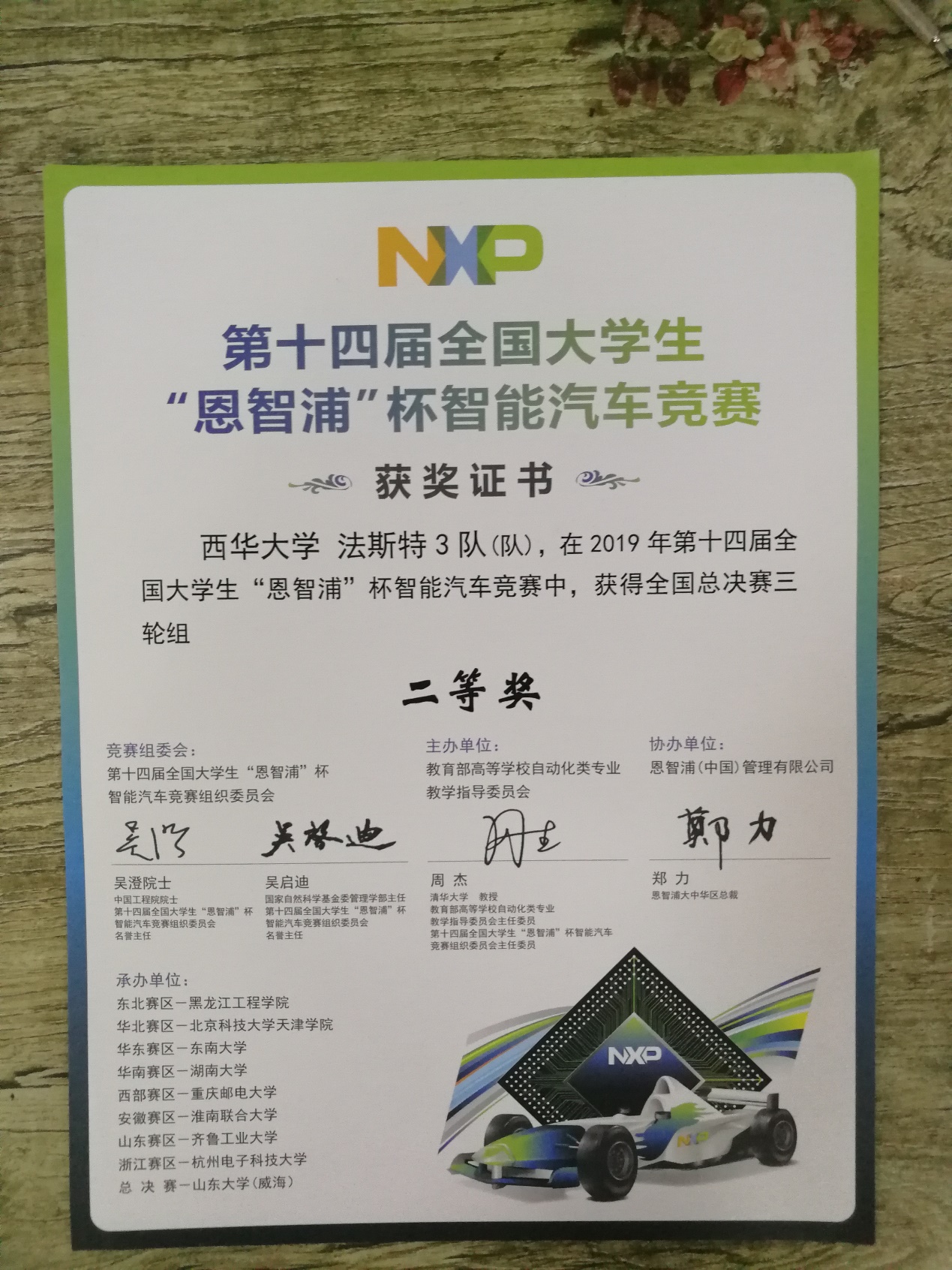 8月22日-25日,由教育部高等学校自动化类专业教学指导委员会主办,恩智浦半导体公司协办的第十四届全国大学生“恩智浦”杯智能汽车竞赛全国总决赛在山东大学(威海校区)举行,我校代表队汽车与交通学院飞思卡尔车队法斯特3队(队员:董康、杨浩楠、罗诚)在彭忆强、陈飞老师指导下,获变形金刚三轮组全国二等奖。