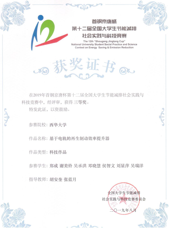 本届大赛自启动以来,吸引了包括清华大学、上海交通大学、浙江大学、西安交通大学、重庆大学等393所高校报名,共计4102件有效作品成功申报,参与高校数和作品申报数量均创历史新高。我校能源与动力工程学院胡安奎、张蓝月老师指导,2017级水利水电工程专业郑成、谢美铃、吴承洪、邓晓慧,2018级能源与动力工程专业侯智文、刘显萍,2018级水利水电工程专业吴瑞洋设计的项目“基于电轨的再生制动效率提升器”获全国三等奖。