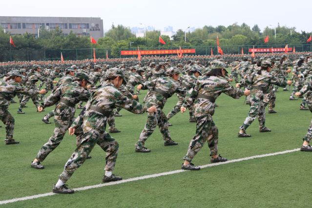 分列式结束后,军训汇报表演正式开始。首先上场的是基础动作展示方队,他们脸上抹着迷彩油,展示了实战演练中的匍匐、翻滚等高难度动作;警棍术方队棍法清晰、步法稳健、身械协调,一招一式尽显军人风采;擒敌拳、刺杀操方队面容严整、动作整齐;军体拳方队的女生亦是巾帼不让须眉,一动一喊,声音嘹亮、动作刚劲;2566名西华学子组成手语操方队,在《我和我的祖国》的歌声中,他们自如变换手势,并排列出“西华”“中国”等字样,对祖国表达最诚挚的祝福,献礼新中国成立70周年华诞。一个个让人眼花缭乱的表演中,西华学子身姿挺拔,脚步坚定,构成了一道亮丽的风景线,赢得了现场观众的阵阵喝彩。
