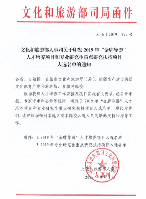 10月09日,文化和旅游部正式公布了《文化和旅游部人事司关于印发2019年“金牌导游”人才培养项目和专业研究生重点研究扶持项目入选名单的通知》,我校美术与设计学院的2018级设计学研究生苟敏获得立项,获批课题名称为《基于智慧旅游的“厕所革命”服务设计研究》,该课题的指导教师为周睿教授。