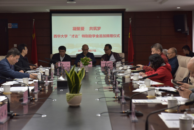 10月27日上午,西华大学“才达”特别助学金追加捐赠仪式暨2019年助学金评审座谈会在办公楼212会议室举行。捐助方18名代表,校党委副书记王小林,校党委副书记、纪委书记李传林,党政办、宣传部、学工部、计财处、审计处等职能部门负责人及17名受助学生代表参加了捐赠仪式和评审座谈会。会议由党委学生工作部部长王大清主持。