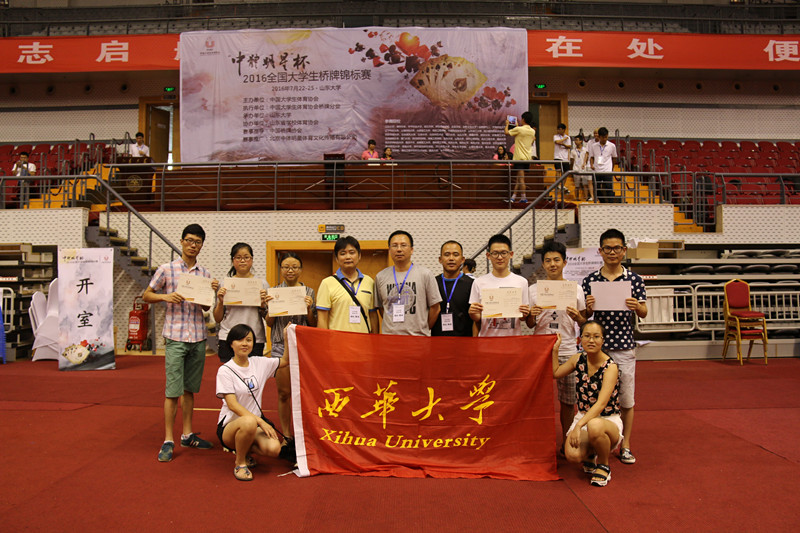 7月22日—25日,由中国大学生体育协会主办的“中体明星”杯2016年全国大学生桥牌锦标赛在山东大学中心校区举行。由电气与信息学院李宏俊、胡一鸿 ,汽车与交通学院刘阳,材料与科学工程学院廖兵组成的我校代表队,在体育学院胡曦临老师的带领下,经过9轮激烈角逐,连克强队获得公开乙级团体赛冠军,这是四川省历史上第一个全国大学生桥牌比赛团体冠军。至此,西华大学桥牌运动队也被中国大学生体育协会桥牌分会升级为甲级队伍。同时,西华大学运动员在公开乙级双人赛中获得第四名,在女子乙级双人赛中获得第八名的成绩。