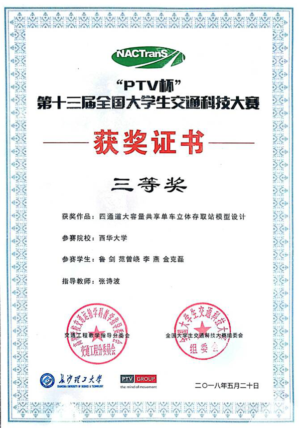全国大学生交通科技大赛(NACTranS)是由教育部高等学校交通运输类教学指导委员会支持,交通工程教学指导分委员会主办的高水平大学生创新竞赛,迄今已连续举办十三届,是纳入高等教育学会《高校竞赛评估与管理体系研究》的19项重点赛事之一。