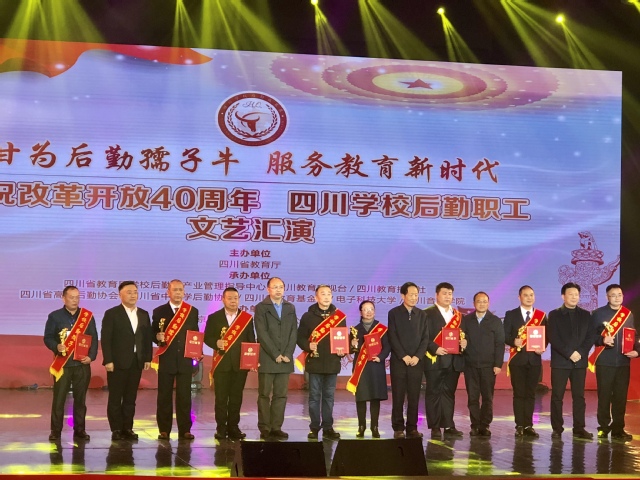 12月25日,“庆祝改革开放40周年,四川学校后勤职工文艺汇演”在电子科技大学清水河校区举行。省关工委常务副主任、省人民政府原副省长徐世群,省委教育工委书记、教育厅厅长、党组书记朱世宏,中国教育后勤协会常务副会长张文忠,省委教育工委副书记,教育厅党组成员刘立云,省委教育工委委员,教育厅副厅长、党组成员张澜涛等出席晚会。晚会表彰了四川省首届“学校后勤孺子牛”先进个人,我校后勤服务总公司职工谭峰获得表彰。