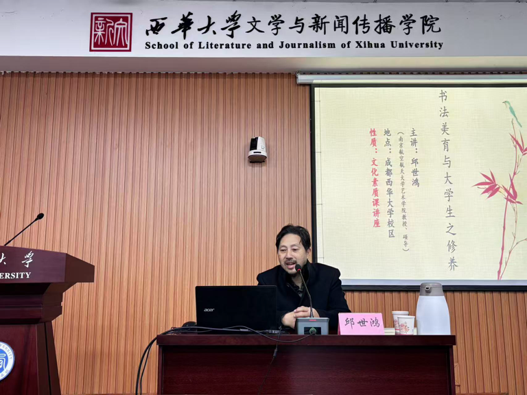 2025年12月1日上午10时,学院特邀南京航空航天大学艺术学院教授、南航书画研究所所长、南京市书协副主席邱世鸿教授作“书法美育与大学生修养”专题讲座。学院教师代表、各年级本科生与研究生代表到场聆听。讲座由学院院长潘殊闲教授主持。