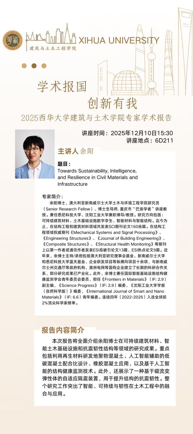 建筑与土木工程学院学术讲座——Towards Sustainability, Intelligence, and Resilience in Civil Materials and Infrastructure