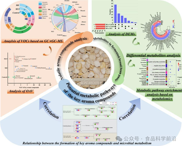 郫县豆瓣是四川菜肴的重要风味基础,其生产通常包括蚕豆瓣发酵、辣椒醅发酵及后续混合发酵三个阶段,其中蚕豆瓣发酵对终产品风味形成尤为关键。随着生产方式由传统露天发酵逐步转向控温密闭发酵,产品标准化和工业化水平不断提升,但密闭发酵条件下微生物多样性受限,导致发酵风味复杂度下降。前期研究表明,解淀粉芽孢杆菌SCPC-RY2021具有耐盐性、产淀粉酶和蛋白酶能力,并具备较强的风味形成潜力,可改善蚕豆瓣发酵品质。然而,该菌株在蚕豆瓣发酵中关键香气物质如何形成、相关前体—产物代谢路径如何变化,仍缺乏系统阐明。