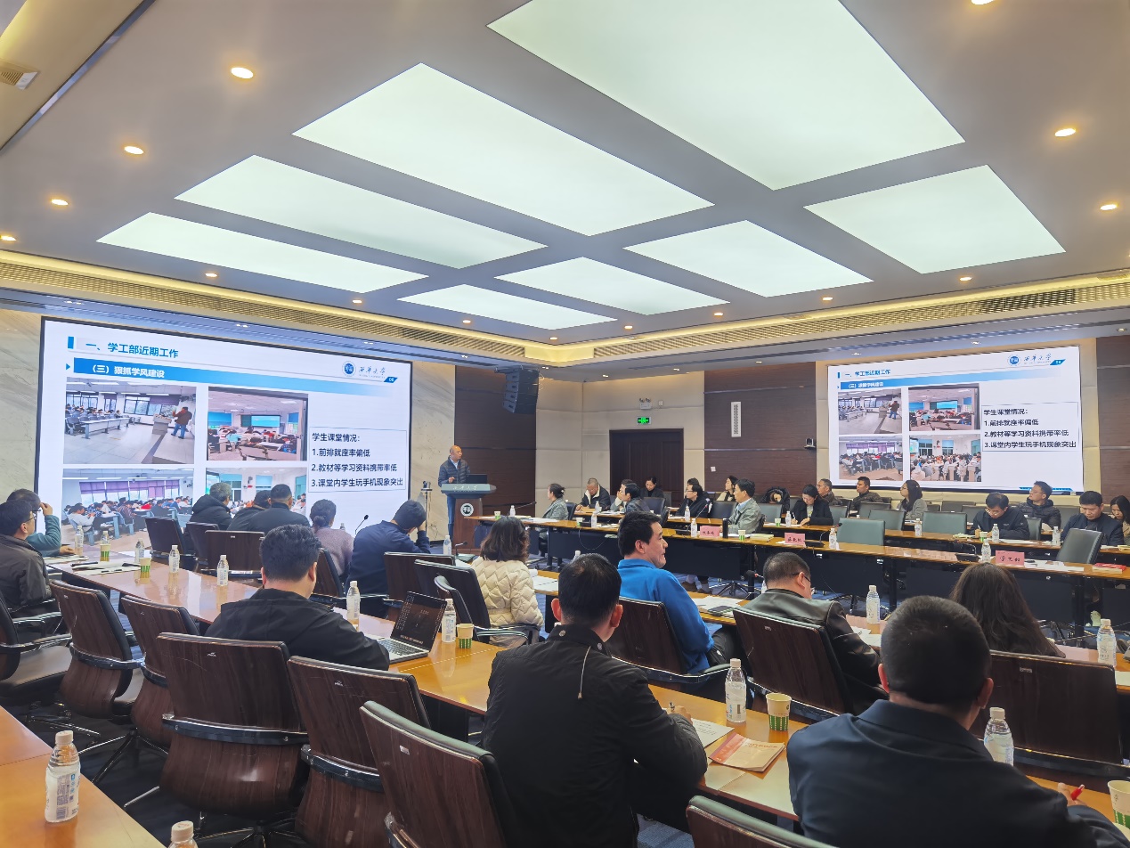 党委学生工作部部长顾鸿飞汇报近期学生工作开展情况,通报学生返校注册、学风建设整体态势,指出课堂出勤等方面存在的问题及整改方向,介绍学校体质提升、劳动教育推进规划,分析当前学生思想状况与就业形势,并强调要抓实心理健康风险防控、辅导员队伍建设工作,精准开展学生学业与就业帮扶。