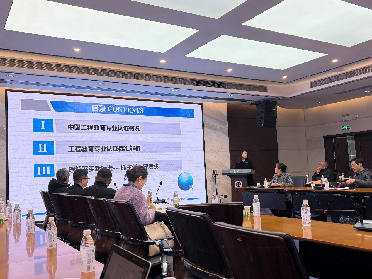 会议还对专业认证重点工作推进进行专项部署。专业认证督导蔡长韬围绕2024版工程教育专业认证标准作专题解读,深入阐释认证核心理念与标准变化,从学生、培养目标等八个方面解析标准调整要点,明确“抓主线、守底线”的落实要求,为各专业推进认证工作明晰思路、提供实操指引。食品与生物工程学院、机械工程学院等6个工科类学院结合专业建设实际,分享工程教育认证推进经验并开展交流研讨,为后续高效推进认证工作凝聚共识。