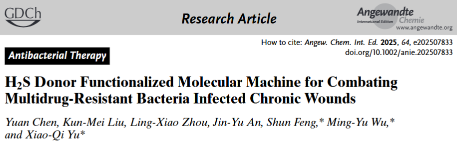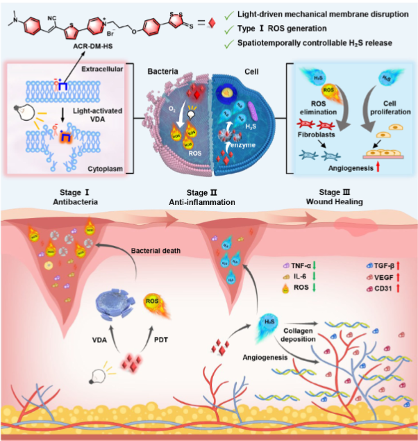 慢性创伤因其复杂多样的病因,如细菌感染、持续性炎症以及血管新生受损,已成为全球性的医学难题。目前的治疗方法面临两大挑战:一是如何对抗细菌耐药性;二是如何实现对细菌消除和炎症减轻的时空控制。开发一种整合抗菌和抗炎功能的全面策略,以促进血管再生和加速伤口愈合,是当前研究的热点。为克服上述问题,团队以丙烯腈为共轭分子骨架,通过引入噻吩扩展π-共轭体系结合电子供体和受体(D-π-A)结构,合成了一种新型的硫化氢(H₂S)供体功能化分子机器(ACR-DM-HS)。该分子机器通过光激活的振动驱动机械化学作用(VDA)选择性地结合并破坏细菌膜,进而与光动力治疗(PDT)协同作用,有效杀灭多重耐药菌及其生物膜,同时抑制耐药性的进一步发展。此外,ACR-DM-HS可在感染组织内释放H₂S,有效清除过量活性氧(ROS),抑制炎性因子的释放,促进血管生成,并加速糖尿病伤口的愈合。研究提出了一种集抗菌与抗炎于一体的治疗策略,为多重耐药菌感染引起的慢性创伤治疗提供了新的思路与手段。