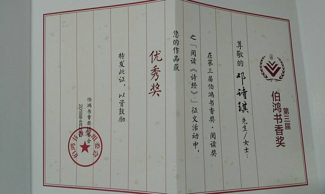本届举办的“同一本书”主题阅读活动,阅读主题为“阅读《诗经》”。在活动中,刘姗珊的《采采卷耳,不盈顷筐》,充分表达了先秦民俗的淳朴和悠然,文笔风流,自成一体。而邓诗琪的《人生自是有情痴》则从爱情的角度再现了先秦之民对爱情的热烈追求,文风缠绵,情意深深。
