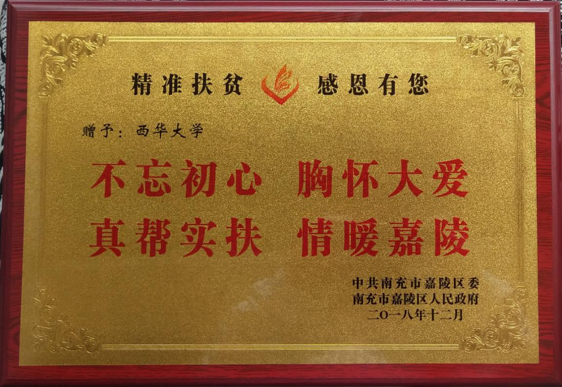 “不忘初心,胸怀大爱,真帮实扶,情暖嘉陵”,这是南充市嘉陵区委、区政府对我校自2015年以来对嘉陵区的对口帮扶工作的充分肯定。在新的一年里,西华大学将不忘初心,在扶贫路上贡献西华力量,在帮扶工作中给予困难群众西华的真心和温度。