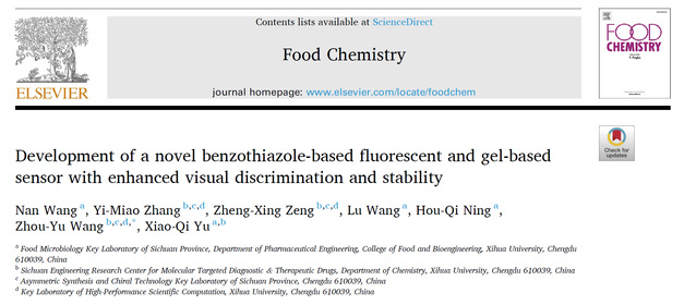 近日,食品与生物工程学院王楠老师在食品领域TOP期刊《Food Chemistry》(Q1,IF: 9.8)发表题为“Development of a Novel Benzothiazole-Based Fluorescent and Gel-Based Sensor with Enhanced Visual Discrimination and Stability”的研究论文。王楠老师为论文第一作者,理学院王周玉教授为本论文通讯作者,西华大学为本论文唯一完成单位。