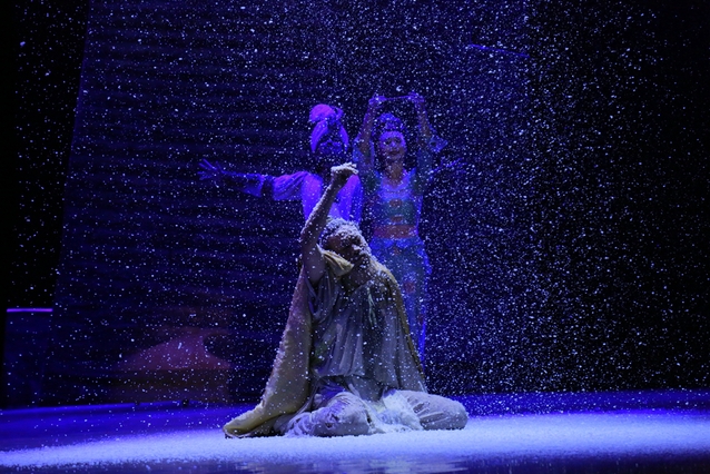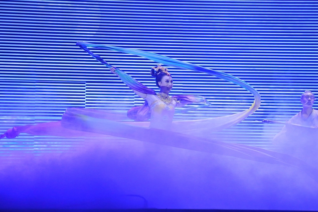 舞台上灯光璀璨,演员们的衣裙不停地翻飞着,现场的气氛也不断地变换。丝绸之路上,各国人民相处融洽,场面一片和谐;英娘沦为歌伎,在鼓上翩翩起舞,舞技之精湛,让人不禁拍手叫好,现场各种舞蹈不停变换着,给观众们呈现了别样的视觉盛宴。神笔张在莫高窟中专心作画,勤勤恳恳,虽然汗水打湿了衣裳,但在女儿英娘的陪伴下苦中作乐,看着女儿优美的舞姿,神笔张灵光乍现,挥笔画下了敦煌壁画代表作——反弹琵琶伎乐天。突然,一纸诏书把英娘征为官伎,温情的画面戛然而止,让观众纷纷叹气;演出还在继续,父女相见却生死诀别,神笔张举笔问苍天,不朽之魂长眠在丝绸古道上,观众席一时充满了叹息还夹杂着几声低低的啜泣。演出在大唐盛世繁华的歌舞声中落下帷幕,现场爆发出雷鸣般的掌声。