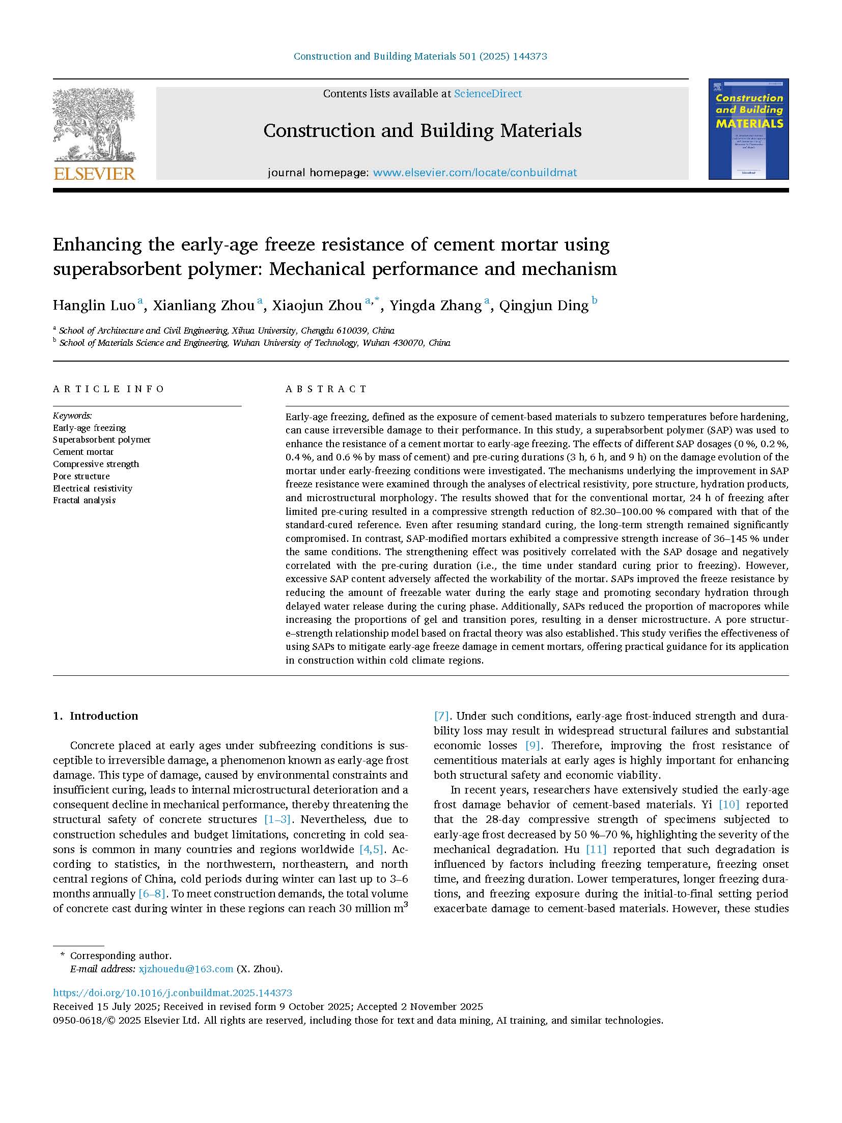 近日,建筑与土木工程学院绿色高性能材料与结构团队在国际著名期刊《Construction and Building Materials》(JCR一区、中科院一区TOP,IF:8.0)发表题为“Enhancing the early-age freeze resistance of cement mortar using superabsorbent polymer Mechanical performance and mechanism”的最新研究成果。西华大学为论文第一单位,建筑与土木工程学院2022级研究生罗航林为论文的第一作者,周孝军副教授为通讯作者,团队周贤良博士与张英达副教授参与相关研究。该项研究还得到了武汉理工大学丁庆军教授的指导。