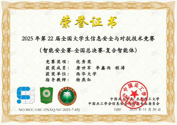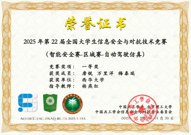 近日,2025年第22届全国大学生信息安全与对抗技术竞赛(ISCC)圆满落幕。汽车与交通学院学子凭借扎实的专业功底与出色的实践能力,在智能安全赛道中的“自动驾驶仿真”“复合智能体”两大核心赛项中脱颖而出,斩获国家级二等奖1项、优秀奖1项,区域一等奖2项、三等奖3项。