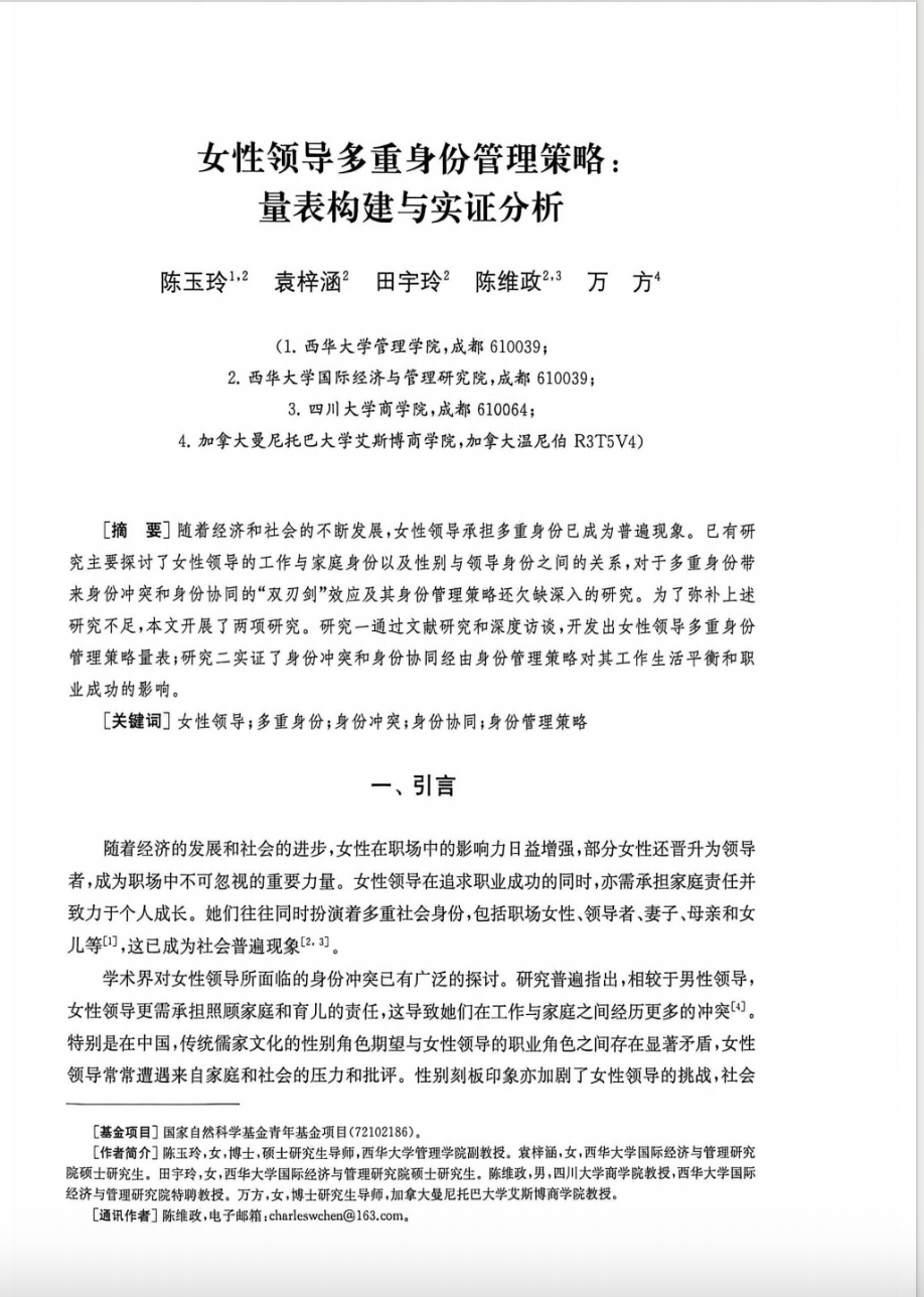 陈玉玲副教授研究团队在《人力资源管理评论》CSSCI期刊发表题为“女性领导多重身份管理策略:量表构建与实证分析”的研究论文,由陈玉玲副教授和陈维政教授共同指导国际经济与管理研究院的研究生完成。陈玉玲副教授为第一作者,研究院工商管理专业硕士生袁梓涵和田宇玲分别为论文第二和第三作者,西华大学为论文完成的第一完成单位兼通讯单位。