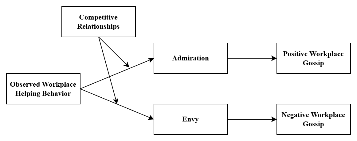 该研究从旁观者视角出发,引入情绪评价路径,突破既有研究主要聚焦施助者与受助者的分析框架,揭示了第三方旁观者在解释工作场所亲社会行为后果中的重要作用,从而拓展了相关研究的理论视角。研究发现,工作场所帮助行为可能通过钦佩和嫉妒双路径机制影响旁观者的职场流言,表明工作场所帮助行为不仅影响直接互动双方,也通过情绪扩散机制塑造更广泛的组织互动结果。研究进一步揭示了旁观者与施助者之间竞争关系的调节作用,说明竞争情境会改变帮助行为所引发的情绪反应及其行为后果,为理解不同竞争氛围下团队互动模式的差异提供了理论依据。