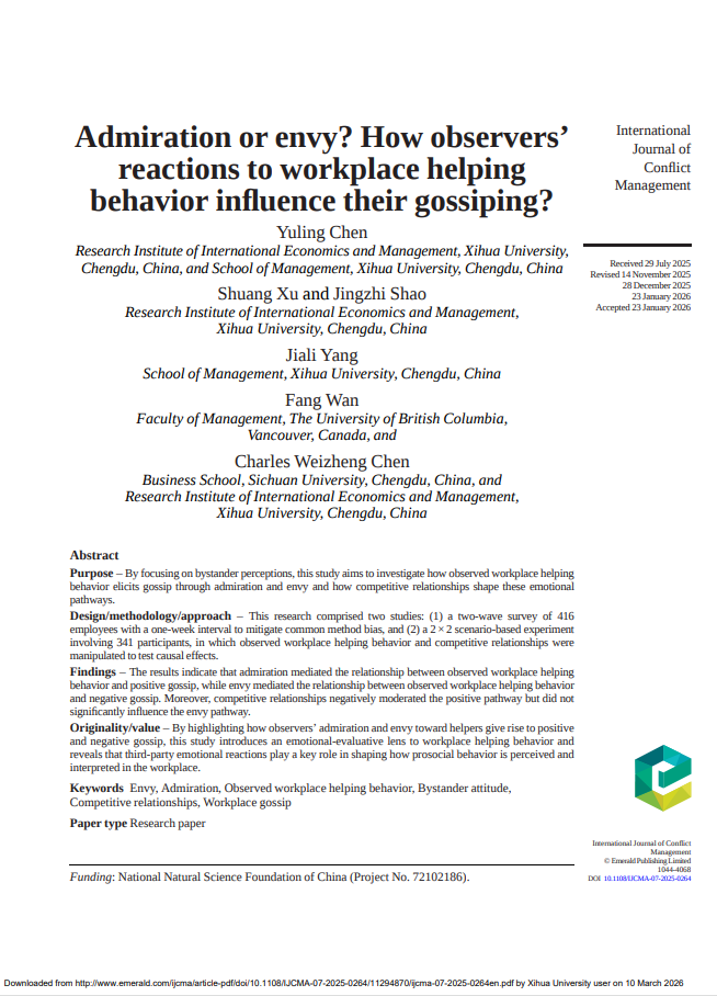 陈玉玲副教授研究团队在《International Journal of Conflict Management》(SSCI一区)发表题为“Admiration or Envy? How Observers’ Reactions to Workplace Helping Behavior Influence Their Gossiping?”的研究论文,由陈玉玲副教授和陈维政教授共同指导国际经济与管理研究院的研究生完成。陈玉玲副教授为第一作者,工商管理专业硕士研究生徐霜和邵婧芝分别为论文第二和第三作者,西华大学为论文的第一完成单位兼通讯单位。