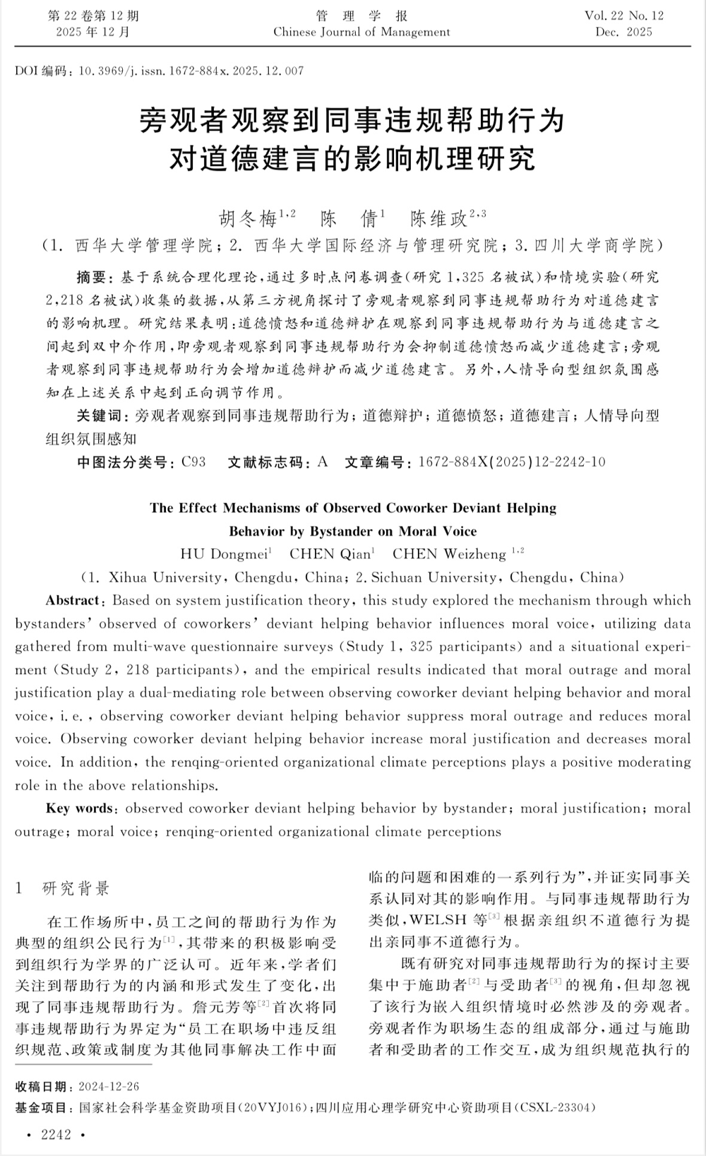 文章基于系统合理化理论,通过多时点问卷调查(研究一,1325名被试)和情景实验(研究二,218名被试)收集的数据,从第三方视角探讨了旁观者观察到同事违规帮助行为对道德建言的双路径影响机理。研究发现,道德愤怒和道德辩护在观察到同事违规帮助行为与道德建言之间起到双中介作用,即旁观者观察到同事违规帮助行为会抑制道德愤怒而减少道德建言;旁观者观察到同事违规帮助行为会增加道德辩护而减少道德建言。此外,人情导向型组织氛围感知在上述关系中起到正向调节作用。
