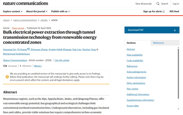 4月初,我校电气与电子信息学院范昊洋老师在国际顶级期刊《自然-通讯》(Nature Communications)发表题为《基于隧道传输技术的可再生能源富集区大容量电力提取》(Bulk electrical power extraction through tunnel transmission technology from renewable energy concentrated zones)的研究论文,为山地高原地区可再生能源外送难题提供了经济高效的大容量输电解决方案。范昊洋老师为论文第一作者,西华大学为第一完成单位,中国科学技术信息研究所黄琦教授为通讯作者,该研究工作得到国家自然科学基金委资助。此项成果标志着我校在新型电力传输技术与可再生能源并网领域取得重要突破。
