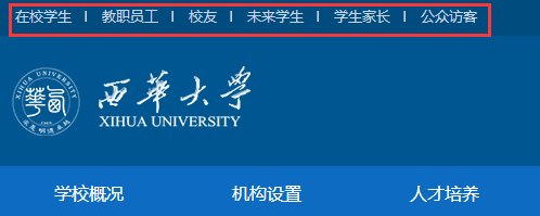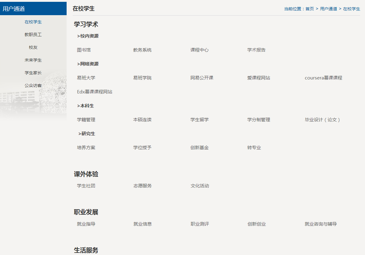 为满足用户需求,新版校园网主页按照访问对象,将用户分为在校学生、教职员工、校友、未来学生、学生家长和公共访客等6大类,为其提供办事导航。