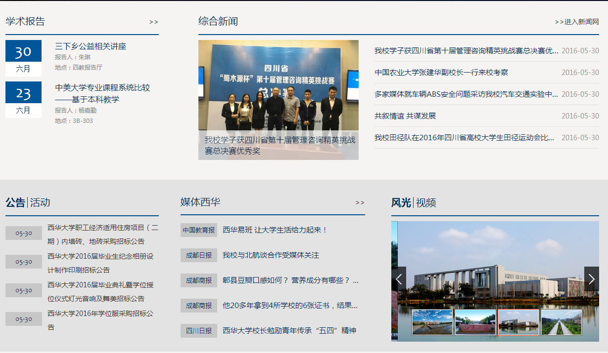 在主页内容方面,设置了“学术报告”、“综合新闻”、“公告”“活动”、“媒体西华”、“风光”、“视频”等板块,点击相应板块,能获取学校更多新闻和服务类信息。
